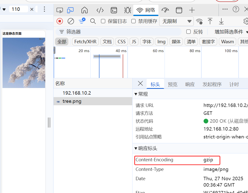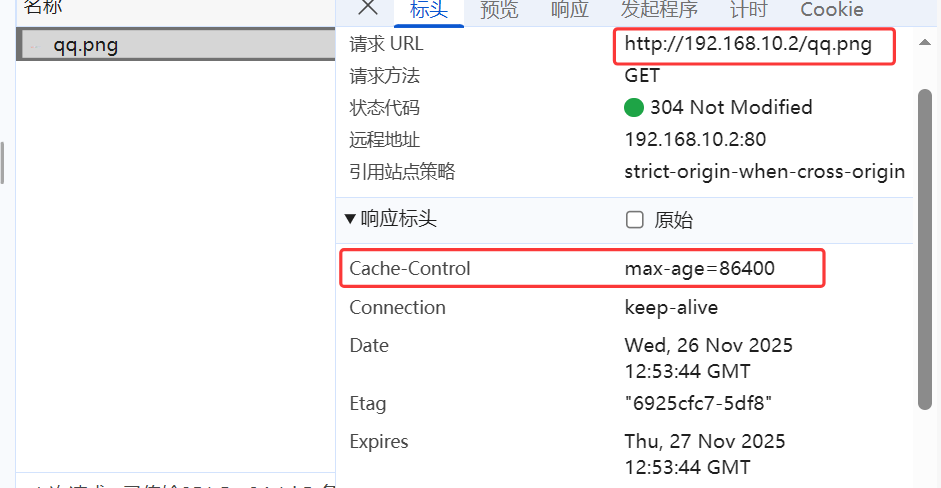 在浏览器中访问192.168.10.2/qq.png,在设置里,找到网络点击,找到Cahce-Control:max-age=86400 表示缓存时间是 86400 秒。也就是缓存一天的时间,一天之内浏览器访问这个页面,都是用缓存中的数据,而不需要向Nginx 服务器重新发出请求,减少了服务器的使用带宽。