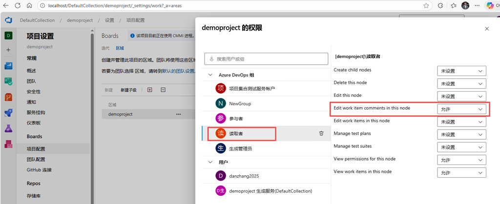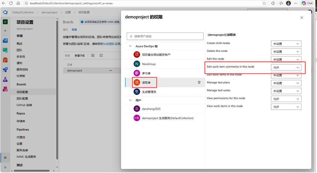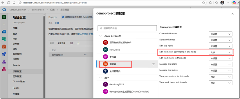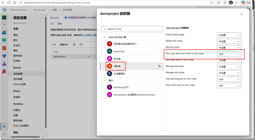 将读取者组的权限"编辑工作项讨论(Edit work item comments in this node)",设置为允许 -