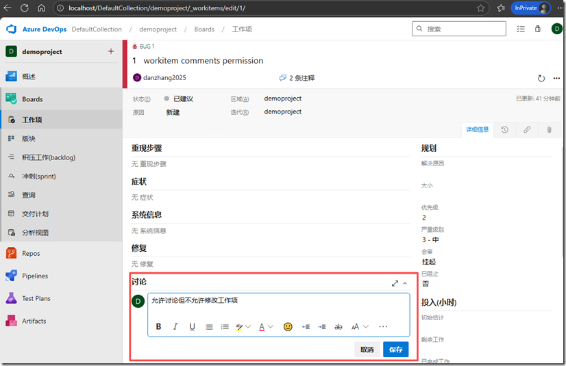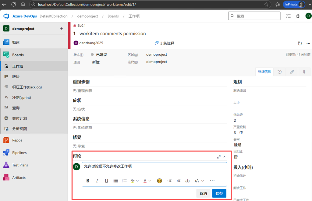 为了解决这个问题,我们需要使用到Azure DevOps Server中工作项中新增加的一种权限"编辑工作项讨论(Edit work item comments in this node)"。这种权限允许或禁止用户或组成员编辑工作项的讨论(comment/discussion)。下面我们结合上面的应用场景,来配置Azure DevOps Server的权限。