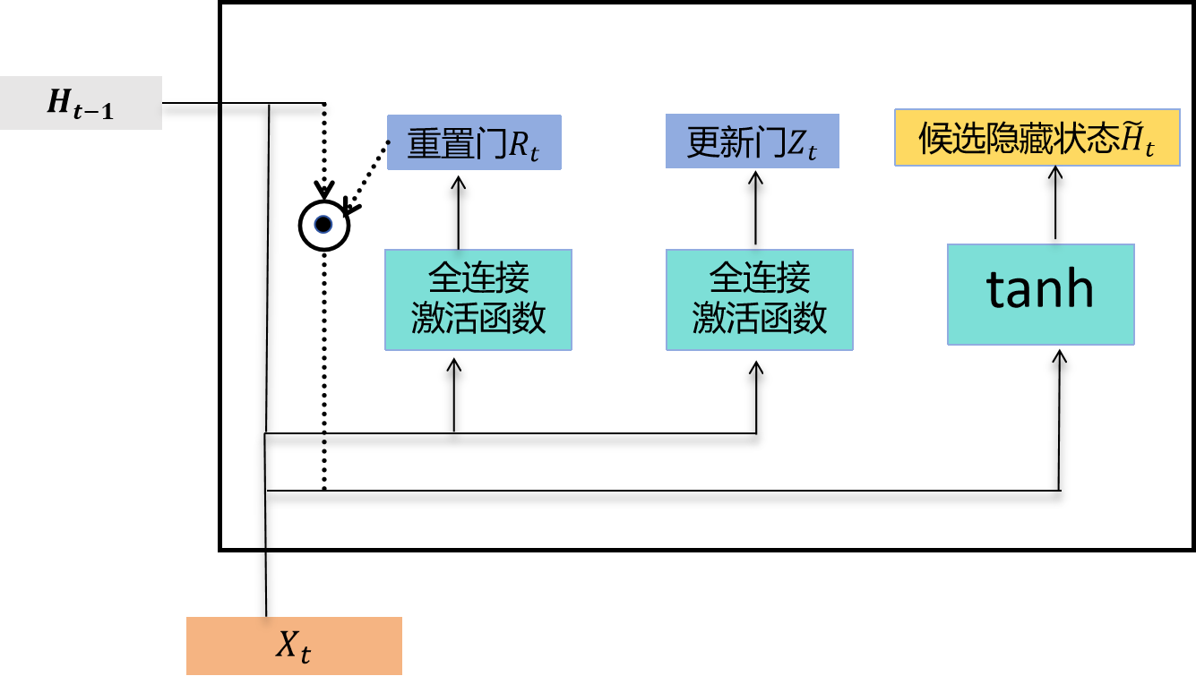 H ~ t = tanh ( X t W x h + ( R t ⊙ H t − 1 ) W h h + b h ) \tilde{H}t = \tanh(X_t W{xh} + (R_t \odot H_{t-1}) W_{hh} + b_h) H~t=tanh(XtWxh+(Rt⊙Ht−1)Whh+bh)