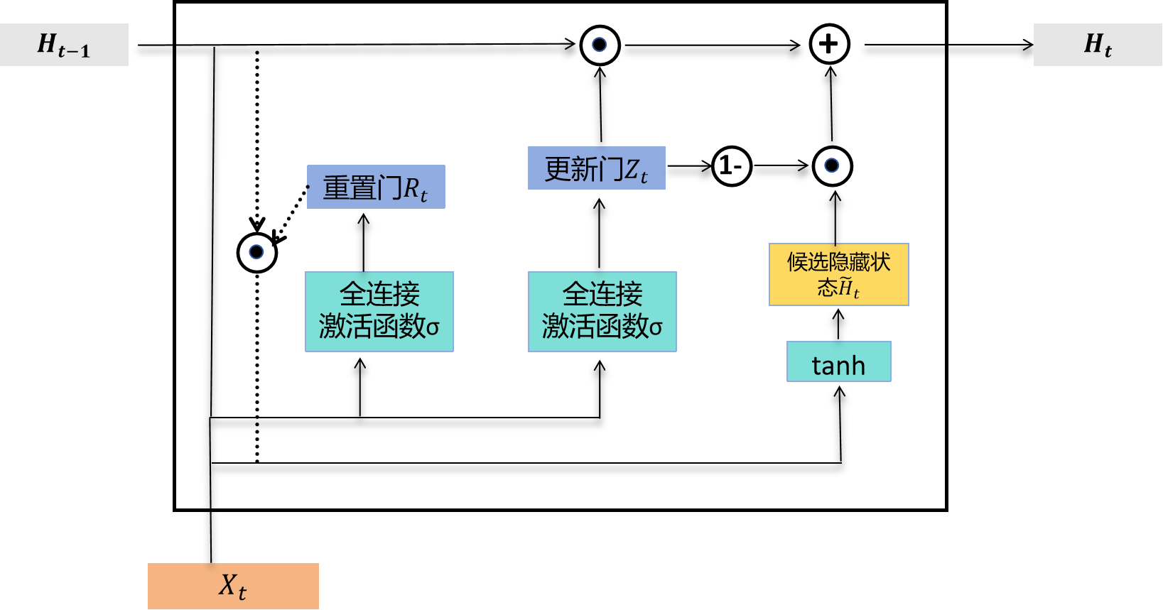 门控循环单元中候选隐藏状态的计算。这里的 ⊙ \odot ⊙表示逐元素乘法