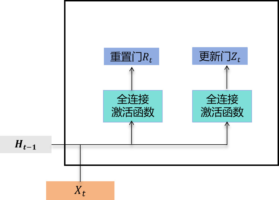 如图所示,门控循环单元中的重置门和更新门的输入都是当前时间步输入 X t X_t Xt与上一时间步隐藏状态 H t − 1 H_{t-1} Ht−1,输出由sigmoid激活函数的全连接层计算得到。