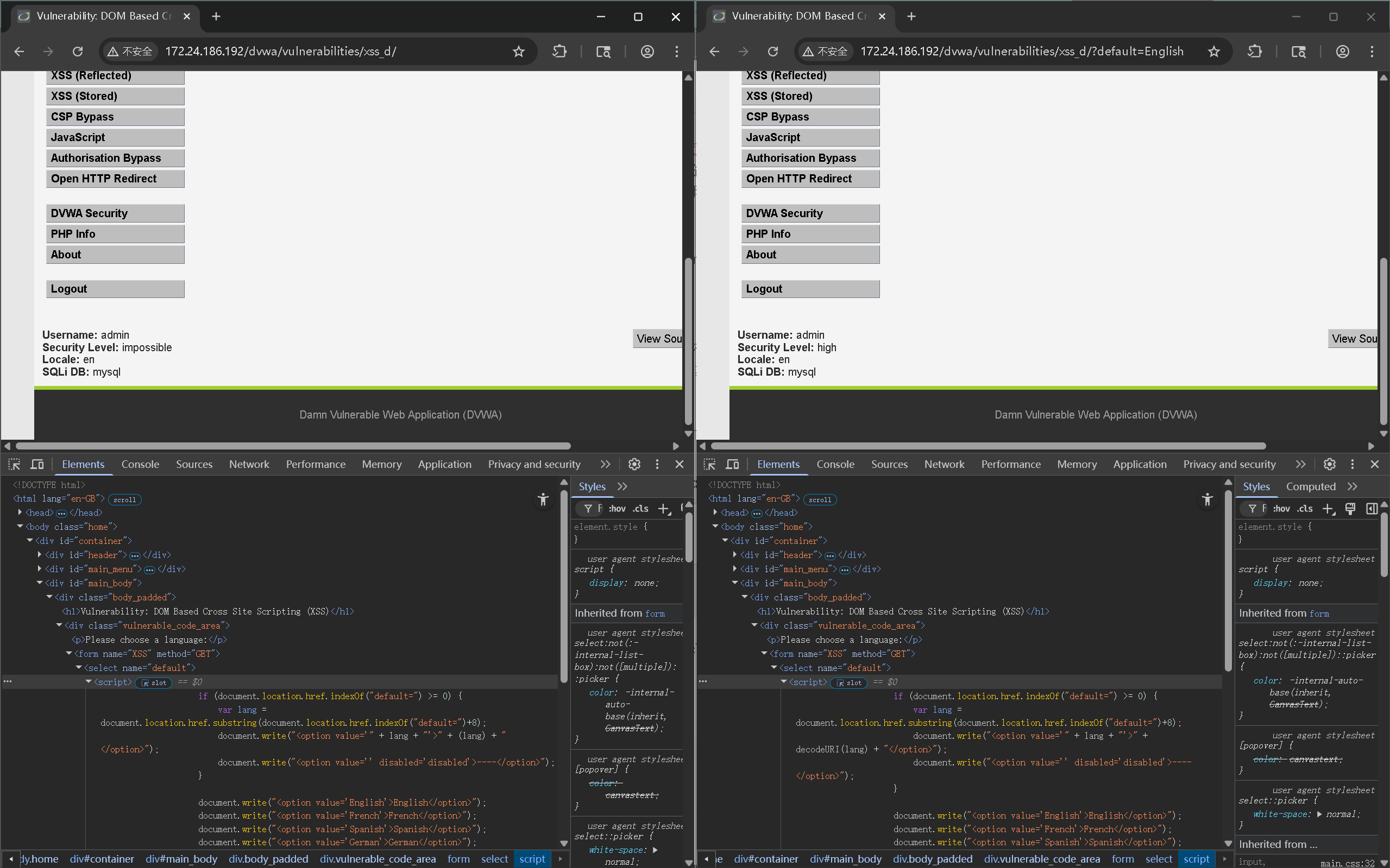 high难度下,对于xss的防护主要有后端的白名单过滤+重定向,它的漏洞主要在前端的location.herf.substring强制截取url的所有内容,++而url中 # 后的内容是不会发送给后端服务器的(这是url的规则,详情可以去学习一下url的各部分组成和作用),++ 但是会由操作被前端读取,也就是绕过了后端,加上document.write这个及其危险的操作使得可以让 # 和后面的危险代码执行