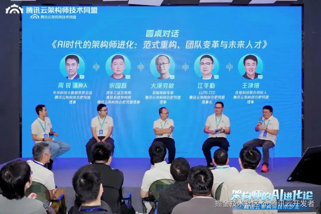 活动最后,来到精彩的圆桌对话环节。在华米科技大数据资深总监、腾讯云架构师合肥同盟理事 周锐的主持下,围绕 "AI 时代的架构师进化:范式重构、团队变革与未来人才"主题,羚羊工业互联网高级系统架构师,腾讯云架构师合肥同盟理事 宋国磊,前端架构专家、腾讯云架构师合肥同盟理事 大漠穷秋,LUMI CTO、腾讯云架构师合肥同盟理事长 江冬勤、优维科技联合创始人、腾讯云架构师合肥同盟理事 王津银,深入探讨架构师如何快速进化,以应对 AI 时代带来的技术挑战,并展望未来职业发展机遇。