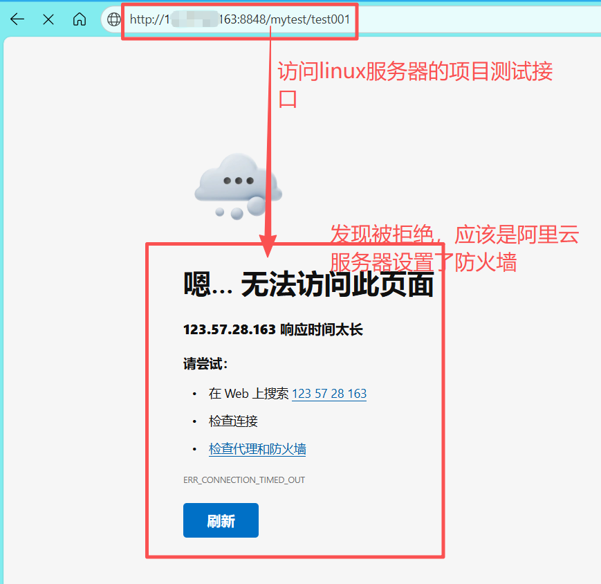 测试发现服务被拒绝,我们需要配置一下阿里云服务器的防火墙。