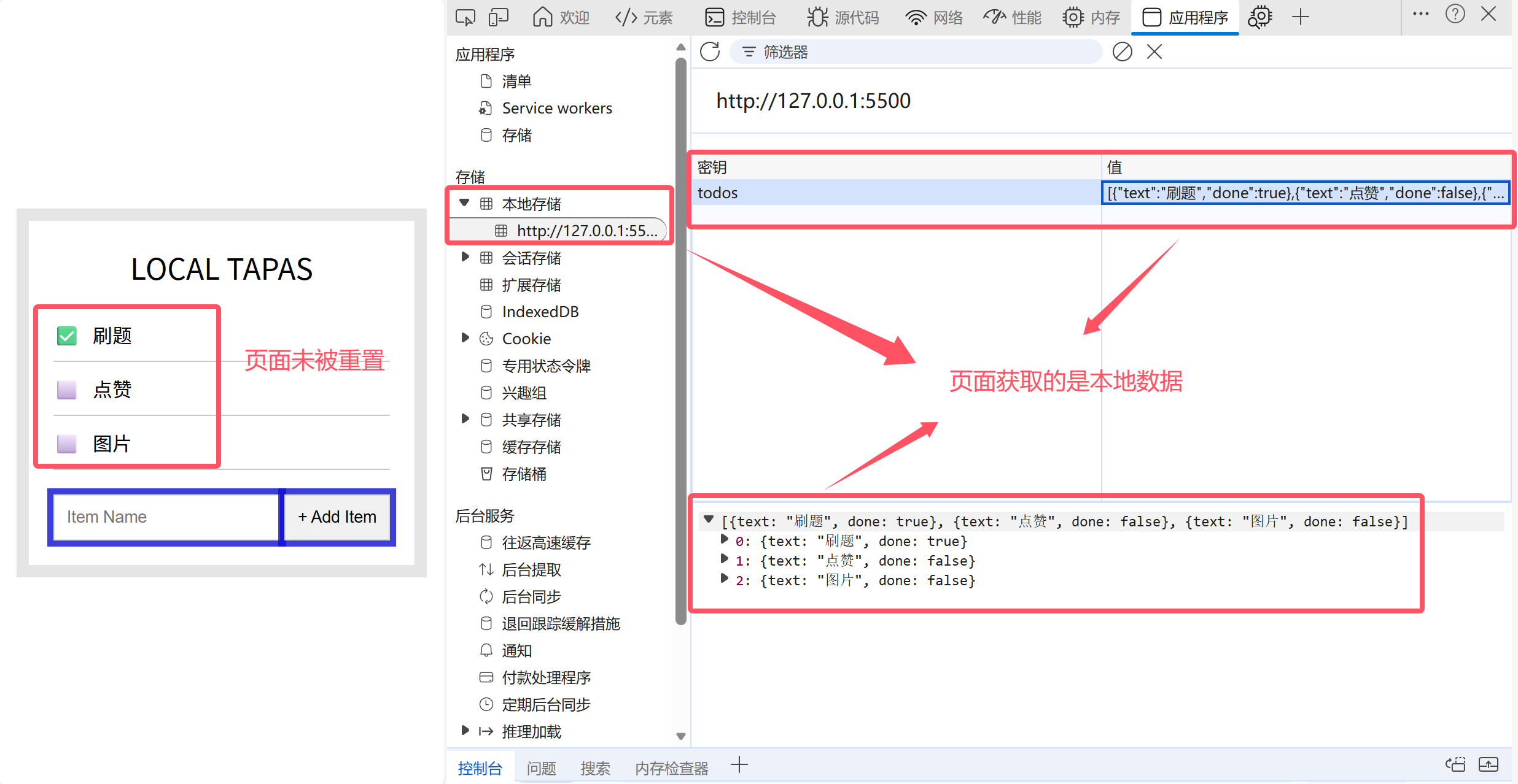 观察下面截图,当我们重新打开页面时会从本地获取数据来保证页面不会被重置: