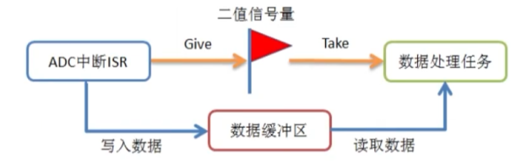 /* 进程间同步,程序跑到ADC中断处肯定是有数据的,刚好释放二值信号量。到了显示任务,刚好获取到信号量数,数据已准备就绪,可以进行显示。 */