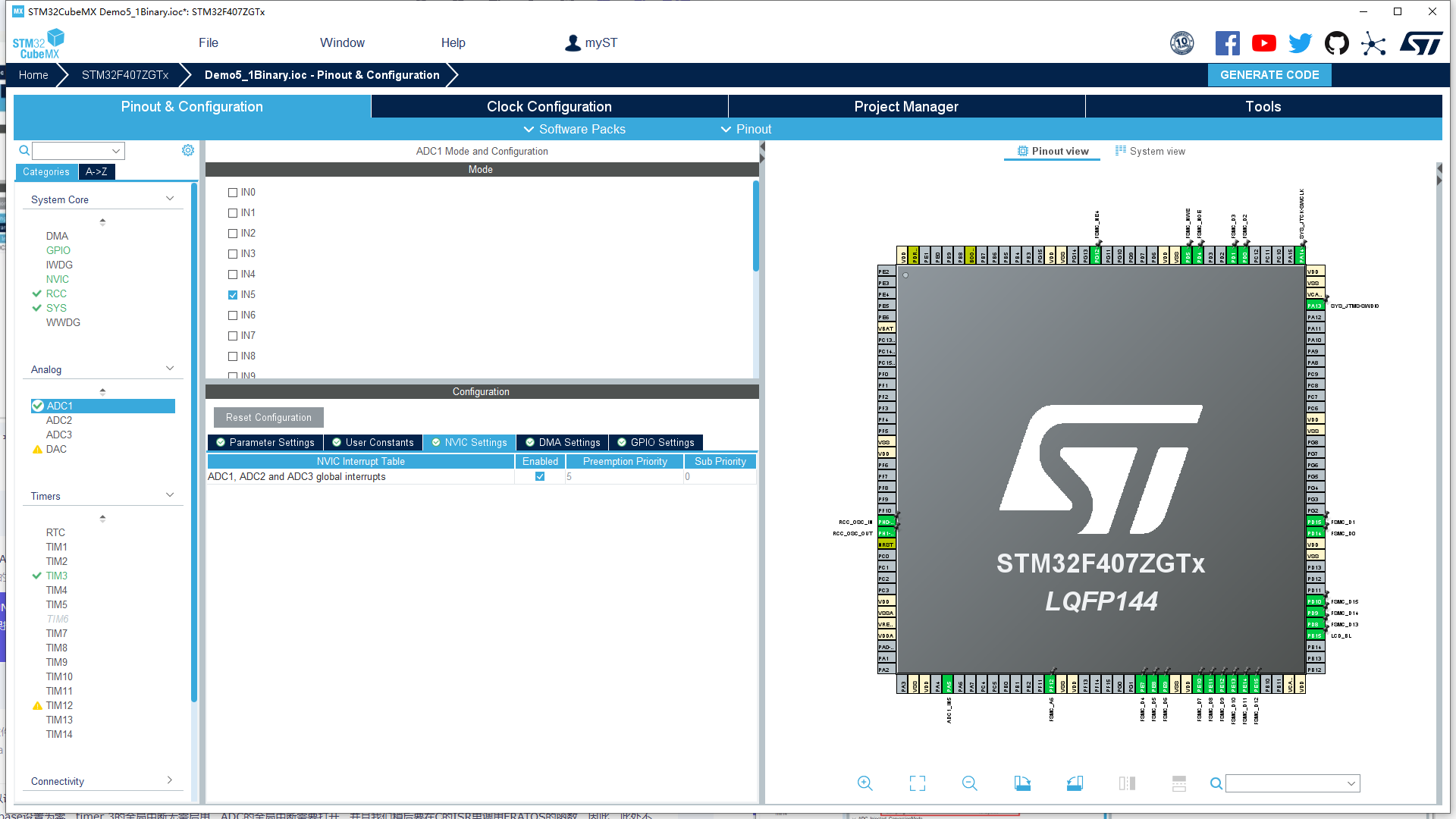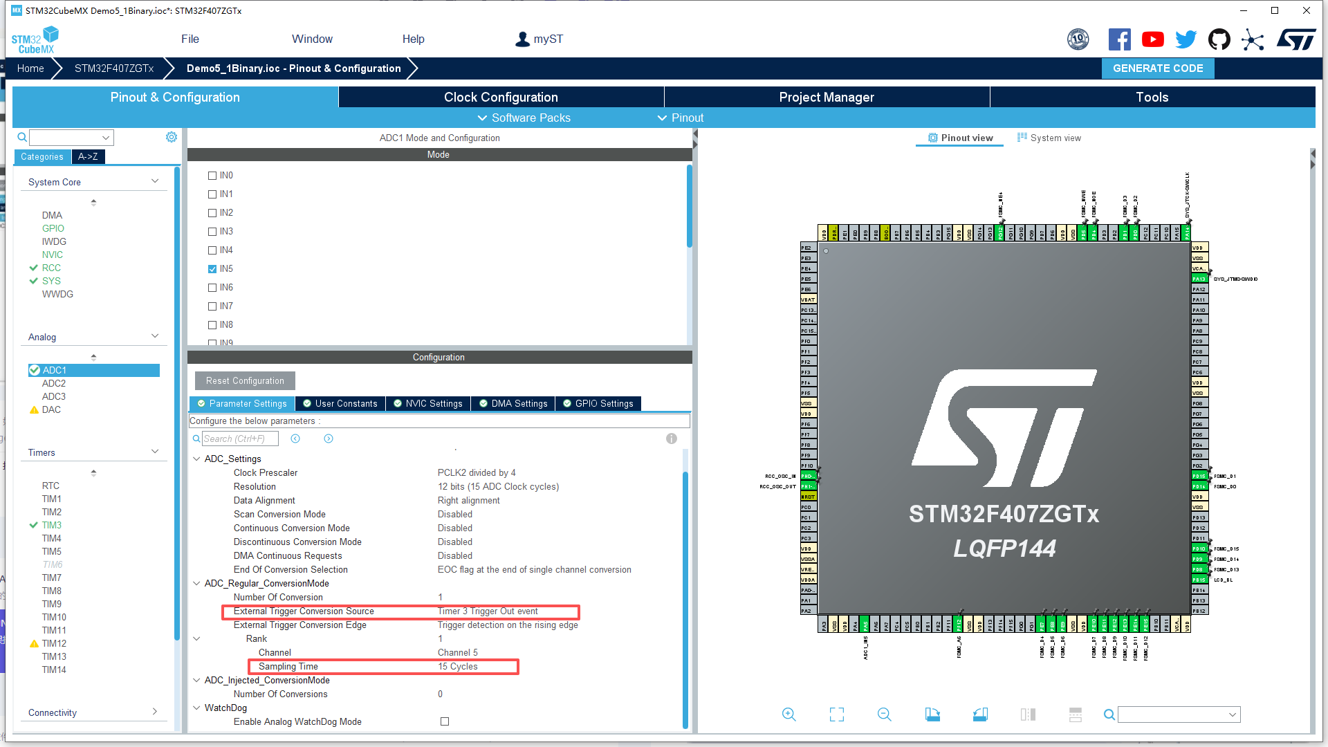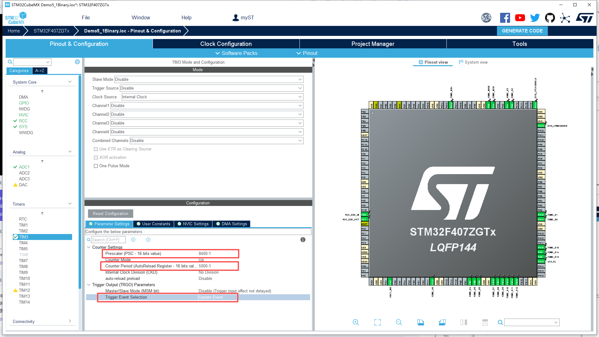 在STM32CubeMX中配置定时器,设置"Trigger event selection"为"update event",使定时器每500毫秒触发一次ADC转换。
