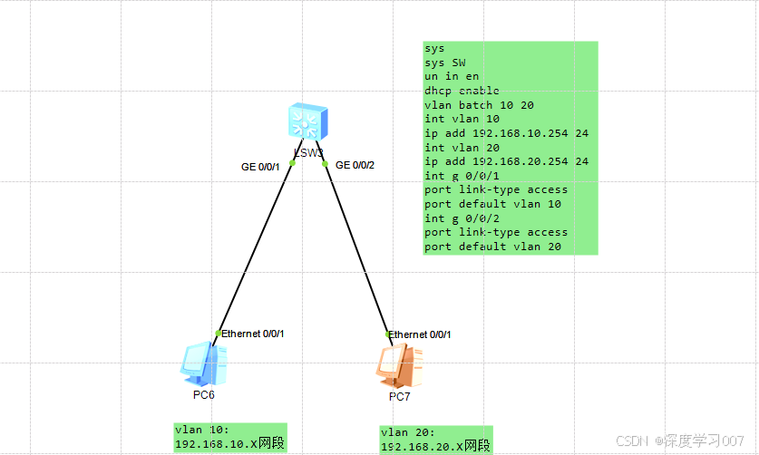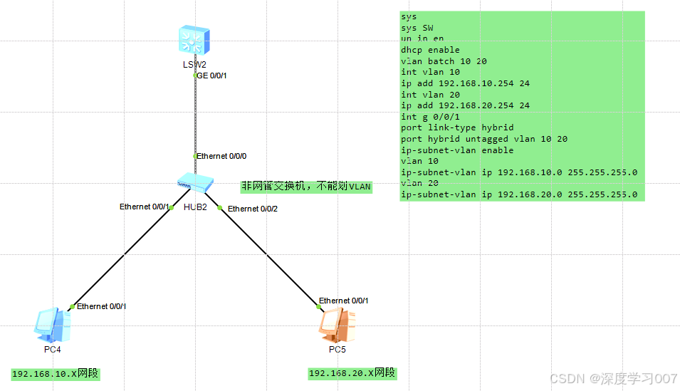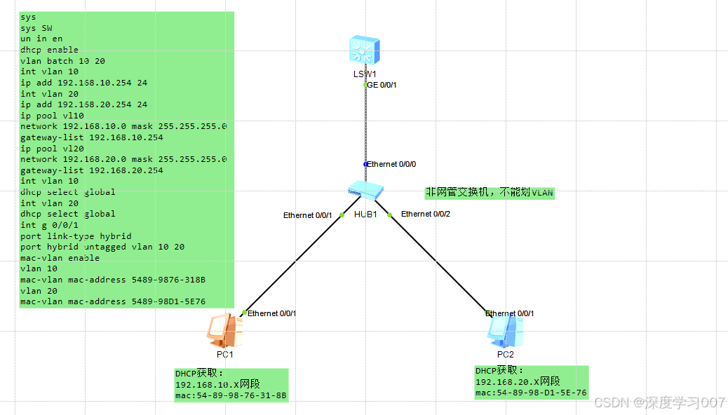 非网管交换机不能进行vlan划分,这样可以保证下联HUB后,下挂的终端还是获取到相应的IP地址,并且进行三层互通。
