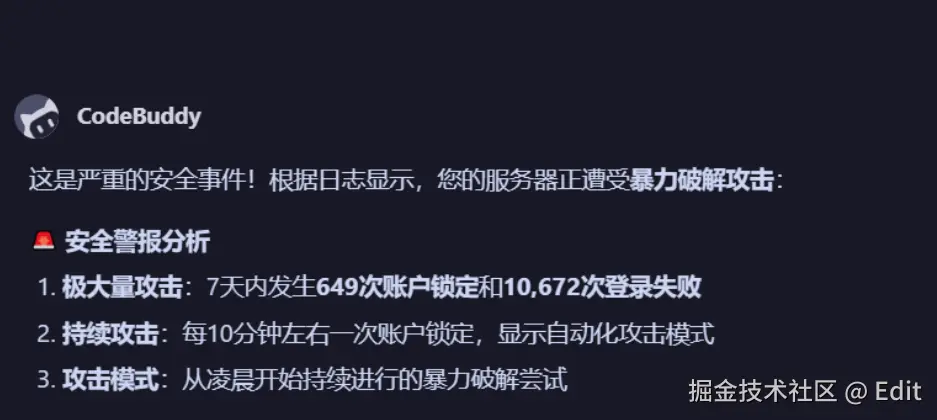 问了下Codebuddy,说是除了暴力破解,也有可能是客户端网络不稳定重连频繁触发,并且给了我一个脚本测试