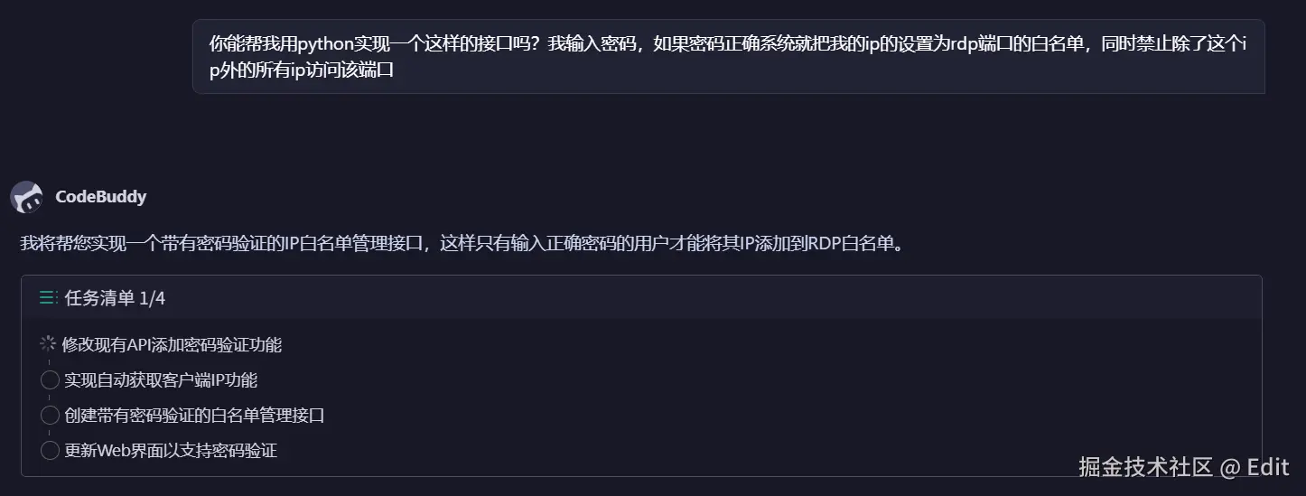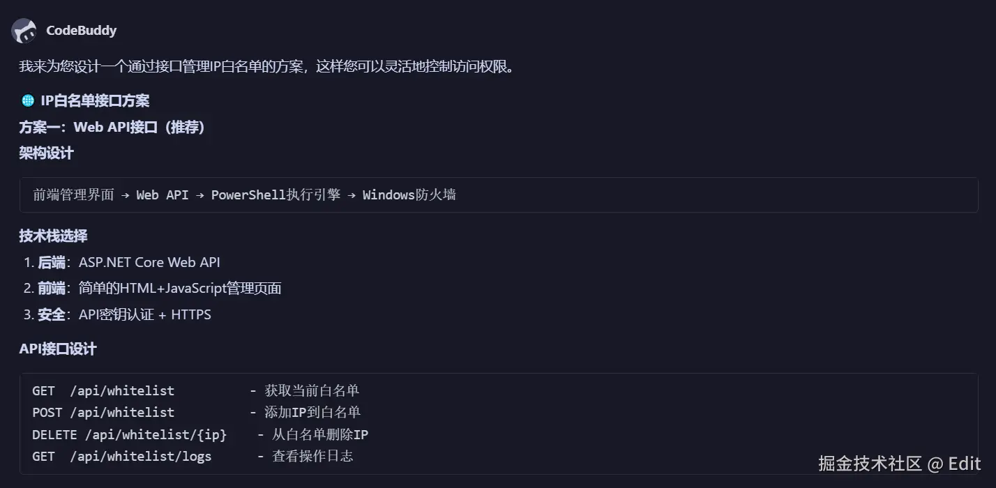 Codebuddy提的方案的思路不错,通过HTTP从用户手中获取白名单IP,然后后端执行命令去添加IP。