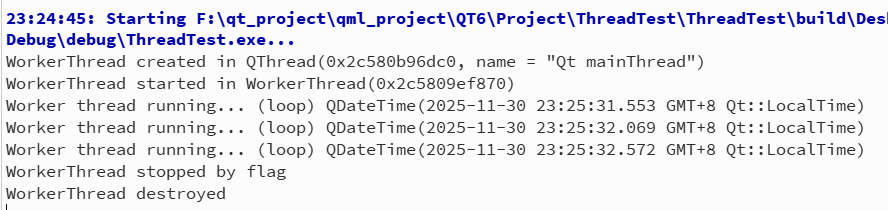 这里我们避免直接使用QThread的stop()接口来结束线程,不然会有问题。为了确保线程安全等问题,这里的bool类型改用了原子操作std::atomic。其实不用的话,逻辑上也没啥大问题。