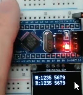 整理一下思路,我们程序一开始,是初始化两个用于指示的字符串显示,之后进行BKP初始化。主循环里,循环执行的逻辑是,先获取键码,如果按键按下,我们就变化一下测试数据。把测试数据分别写道BKP的DR1和DR2。再在OLED显示一下写入数据,然后再没有按键按下时,我们也不断的读取BKP的DR1和DR2的寄存器。刷新显示到OLED上。看一下当前BKP的数据。