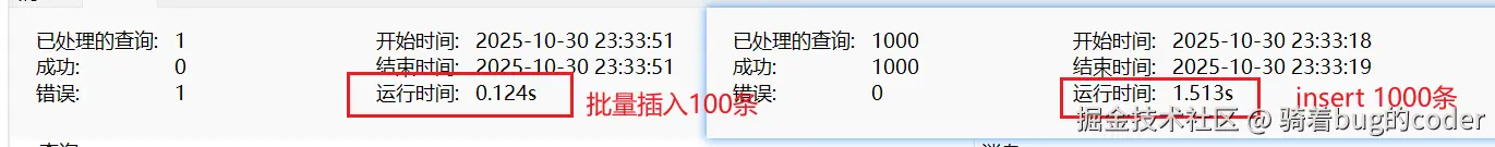 单条插入,MySQL要:连接→插入→提交→断开,每次都要经历这个过程。 批量插入,只需:连接→插入插入插入...→提交→断开,一次搞定。