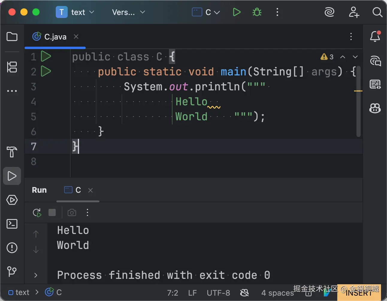 文本块(Text Blocks)的格式有特殊之处,例如在三个双引号开启文本块的那一行,文本块中不能有非 white space 字符 ⬇️