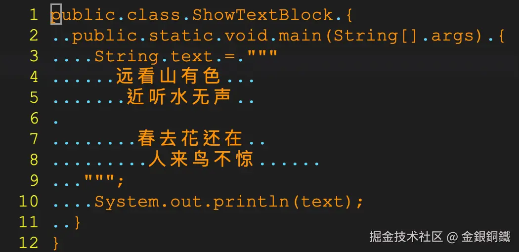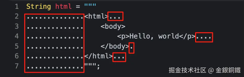 有些时候,文本块的内容可能是从其他地方复制过来的,复制过程中,在某些行的末尾(有意地或无意地)多加一些空格(U+0020)也是常见的情况。甚至被复制的文本本身就有在行尾的多余空格。所以在日常开发的过程中,代码也许会变成这样 ⬇️ (为了让空格变得容易辨认,下面这段代码里用 . 字符来表示空格)