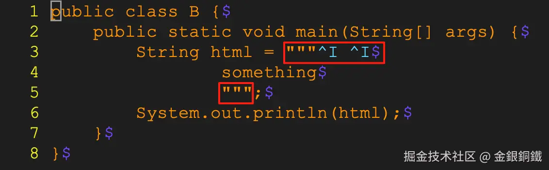 上面这段代码里有些特殊的字符,我通过 vim 打开这段代码后,截了张图,效果如下 ⬇️