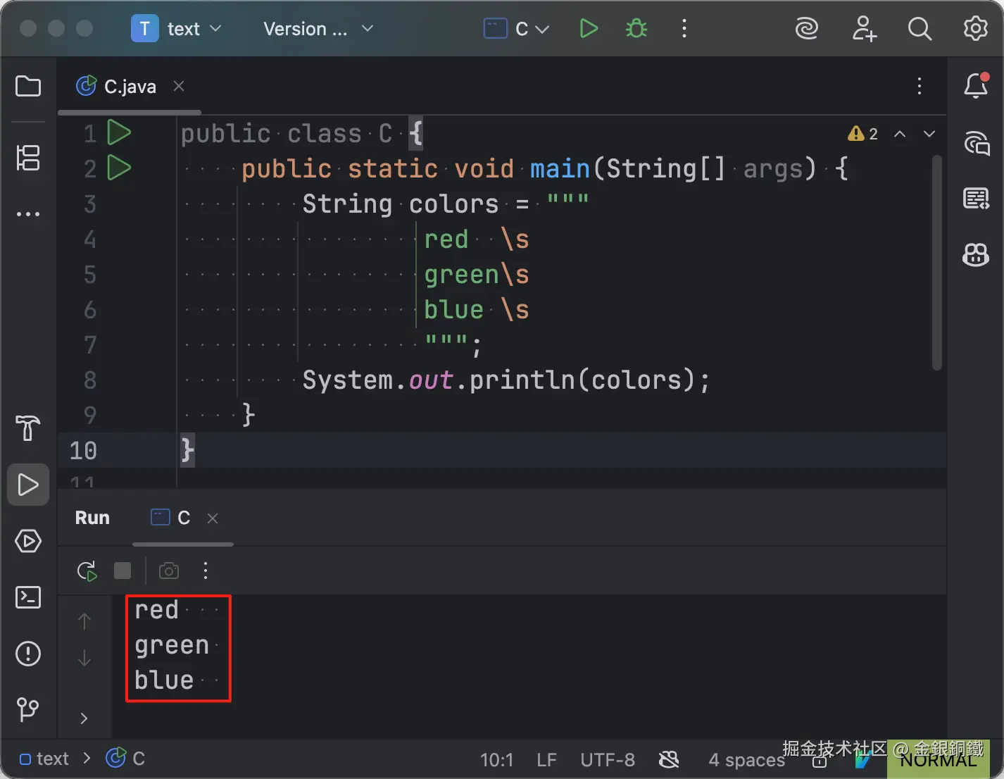 \s 这个转义序列会被转化为空格(U+0020)字符。为什么需要这个转义序列呢?有的时候,我们确实需要在行尾的 white space,但是行尾的 white space 会在第 <math xmlns="http://www.w3.org/1998/Math/MathML"> 2 2 </math>2 步中被移除。所以我们可以通过使用 \s 转义序列来保留必要的 white space。举个例子,如果我们在 Intellij IDEA 中运行 C 中的 main 方法 ⬇️ 那么会看到标准输出共有 3 行,每一行的结尾都有空格字符(例如 green 后面有一个空格)。