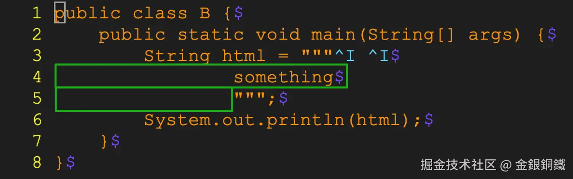 使用 \<line-terminator> 可以阻止插入换行符。例如在 JDK 15 之前,我们可以这样拼接出一个比较长的字符串(请注意,这个字符串中没有换行符)⬇️