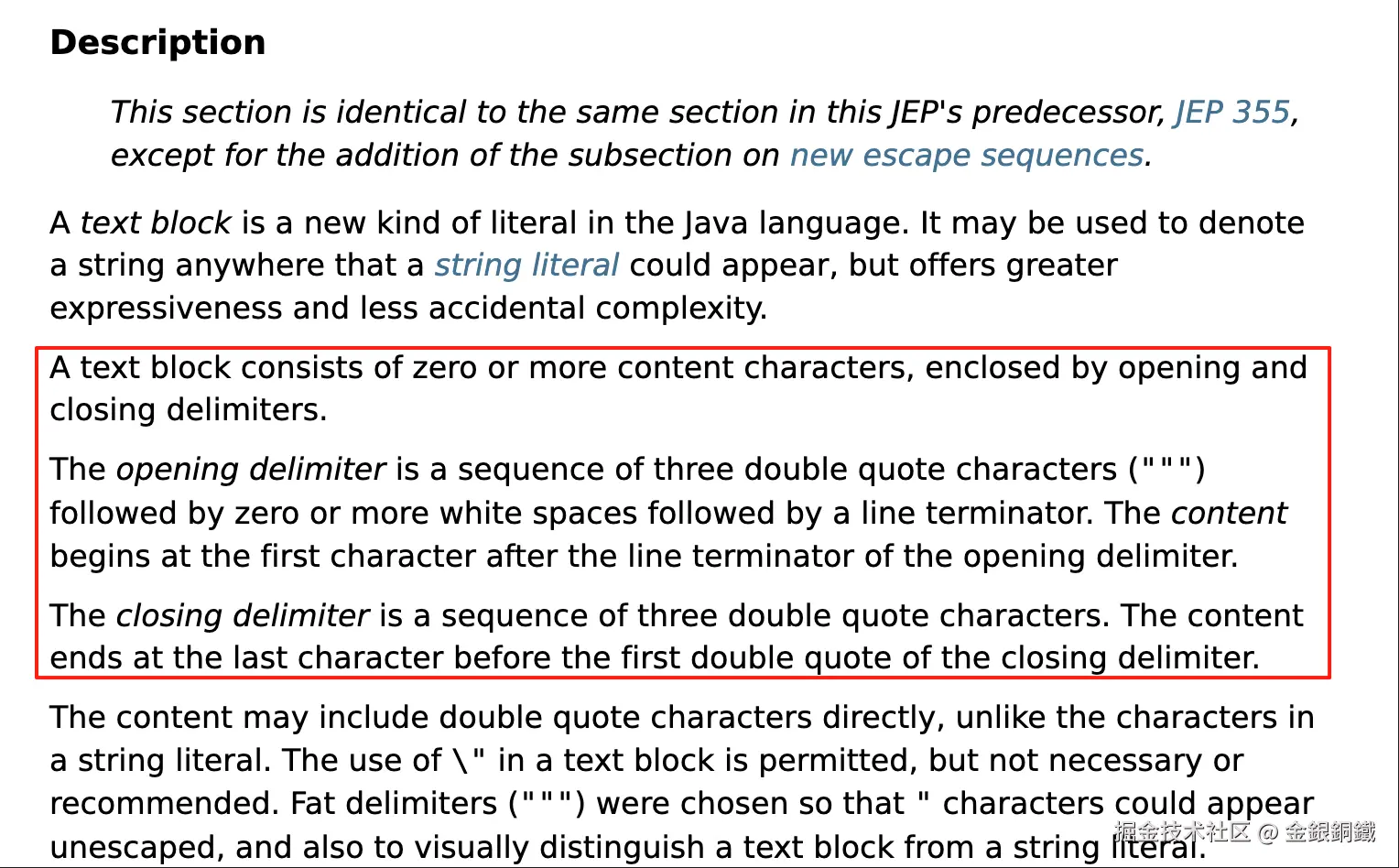 在讨论其他问题之前,我们先来明确一下文本块(Text Blocks)的范围。在 JEP 378: Text Blocks 一文的 Description 小节里,有如下的描述,我们着重看一下红框里的部分。
