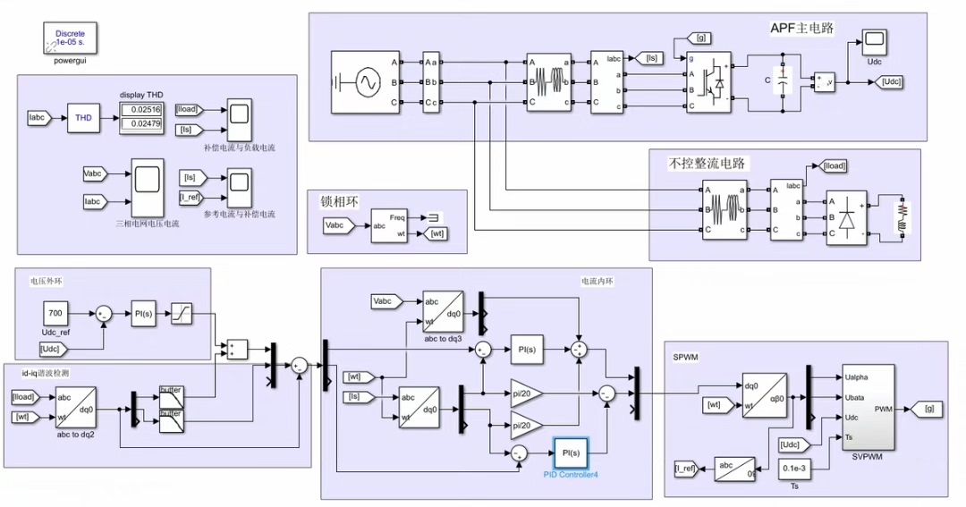 最近在实验室搞APF仿真时踩了不少坑,今天把完整的实现流程整理成笔记。这个基于PI双环控制的并联型APF方案实测谐波补偿率能达到90%以上,先看整体仿真架构: