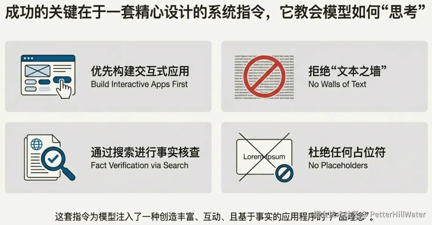 在整个架构中,系统指令的重要性不言而喻。它相当于为AI模型设定了一套严格的"世界观"和"行为准则"。我们总结并强制模型遵循以下几条核心理念(Core Philosophy):