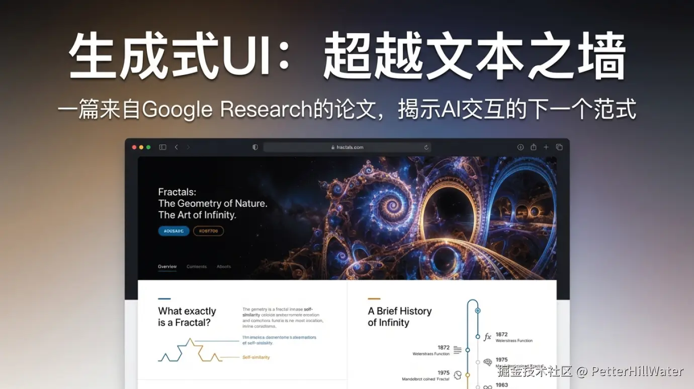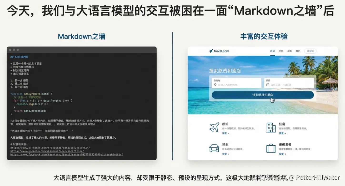 在当前的技术浪潮中,大语言模型(LLM)已展现出在内容生成方面的卓越能力,深刻地改变了我们获取与处理信息的方式。然而,这些强大的模型在输出形态上普遍受限于静态、预定义的界面,最常见的便是由标题、列表和代码块组成的Markdown"文本墙"。这种呈现方式虽然有效,却远未能完全释放AI生成内容的潜力。