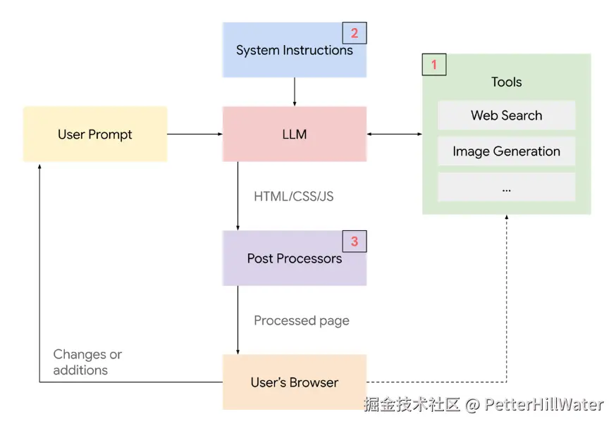 - 轻量级后处理器 (Post-processors) 尽管最先进的模型能力已非常强大,但在生成复杂的代码时仍可能出现一些常见的、模式化的小问题。后处理器的作用就是在模型输出后,自动进行一系列检查与修复。其职责包括安全地注入API密钥、修复常见的HTML/CSS/JavaScript语法错误、以及处理其他可预测的遗留问题,从而保障最终页面的健壮性。