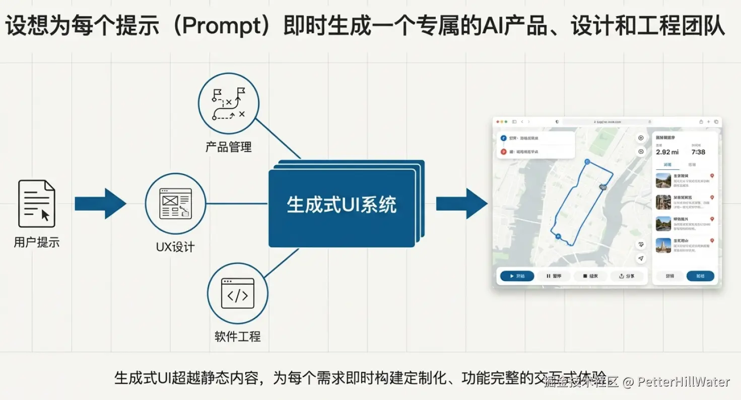 为了更形象地阐释这一愿景,我们引入一个核心比喻:"为每个提示词即时组建一支AI团队"(An instant AI team for each prompt)。传统的优质应用需要产品经理、用户体验设计师和软件工程师组成的团队历经数周甚至数月才能打造完成。而生成式UI则能在短短一两分钟内,为任意一个特定的提示词,即时"组建"一支具备同等能力的AI团队,从而生成一个量身定制的、无需编码的交互式体验。