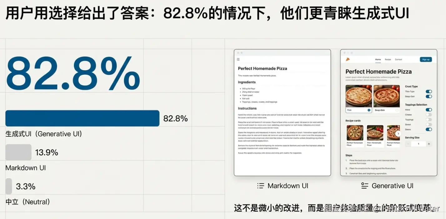 为了直观展现生成式UI的变革性,下表对比了其与传统Markdown输出的核心差异: