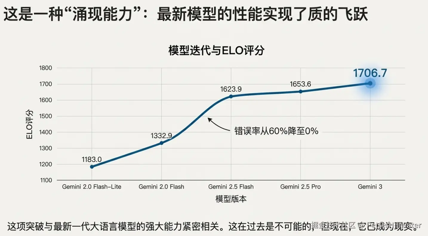 生成式UI的稳健实现,并非源于某项单一的技术优化或算法突破,而是更深层次现象的体现。本章的核心论点是:高质量的UI生成能力,是一种随着底层大语言模型能力实现跨越式发展而自然产生的"涌现能力"(Emergent Capability)。