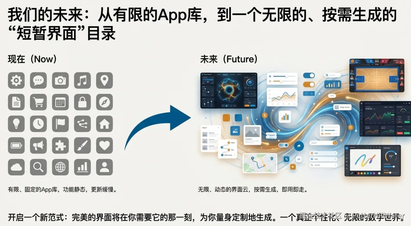 生成式UI的出现,预示着从"选择应用"到"生成应用"的转变。它有望从根本上改变用户与数字世界的互动方式,为每一个独特的需求、每一个稍纵即逝的想法,都创造一个专属的、功能完备的数字工具。