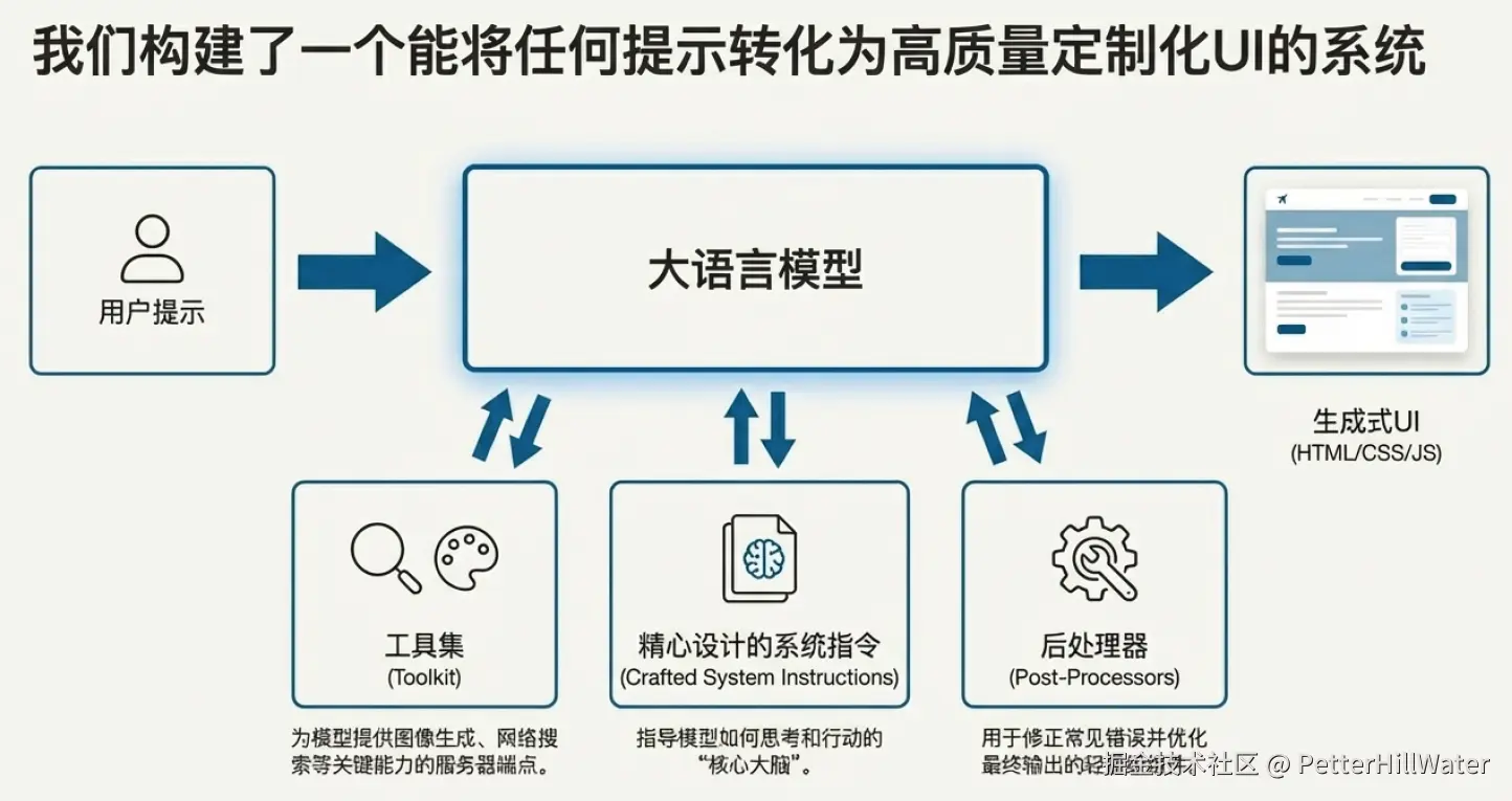 要实现从一个简单的用户提示词到功能完备的交互式页面的转化,需要一个稳健且设计精巧的底层技术架构。本章将揭示支撑生成式UI系统运行的核心组件及其协同工作机制。