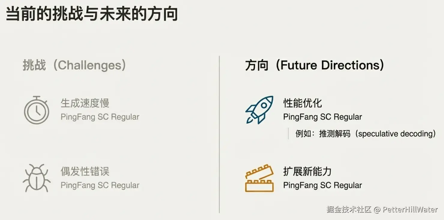 综上所述,生成式UI的成功是建立在两大基石之上的:最先进模型的涌现能力,以及能够充分激活并引导这种能力的精妙提示工程。在肯定其巨大成就的同时,我们也必须正视其当前面临的现实挑战。
