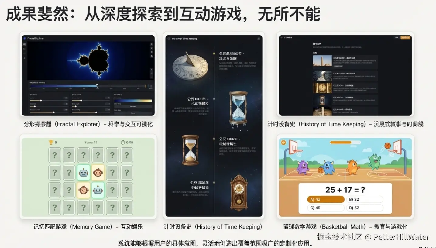 • 优先构建交互式应用 (Build Interactive Apps First): 即使面对一个可以用简单文本回答的查询(如"现在几点了?"),系统也应优先创造一个动态应用(如一个实时运行的时钟),而非返回静态文字。