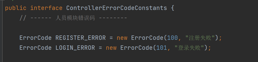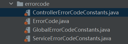 定义业务状态码类,ErrorCode(code,msg),因为我们此项目自定义异常按分层定义了两种异常,所以就只需要为这两个异常定义两个状态码常量类来区分同一个异常不同的逻辑错误,还有为统一结果返回定义一个状态码(global),所以就 controller+service+global)
