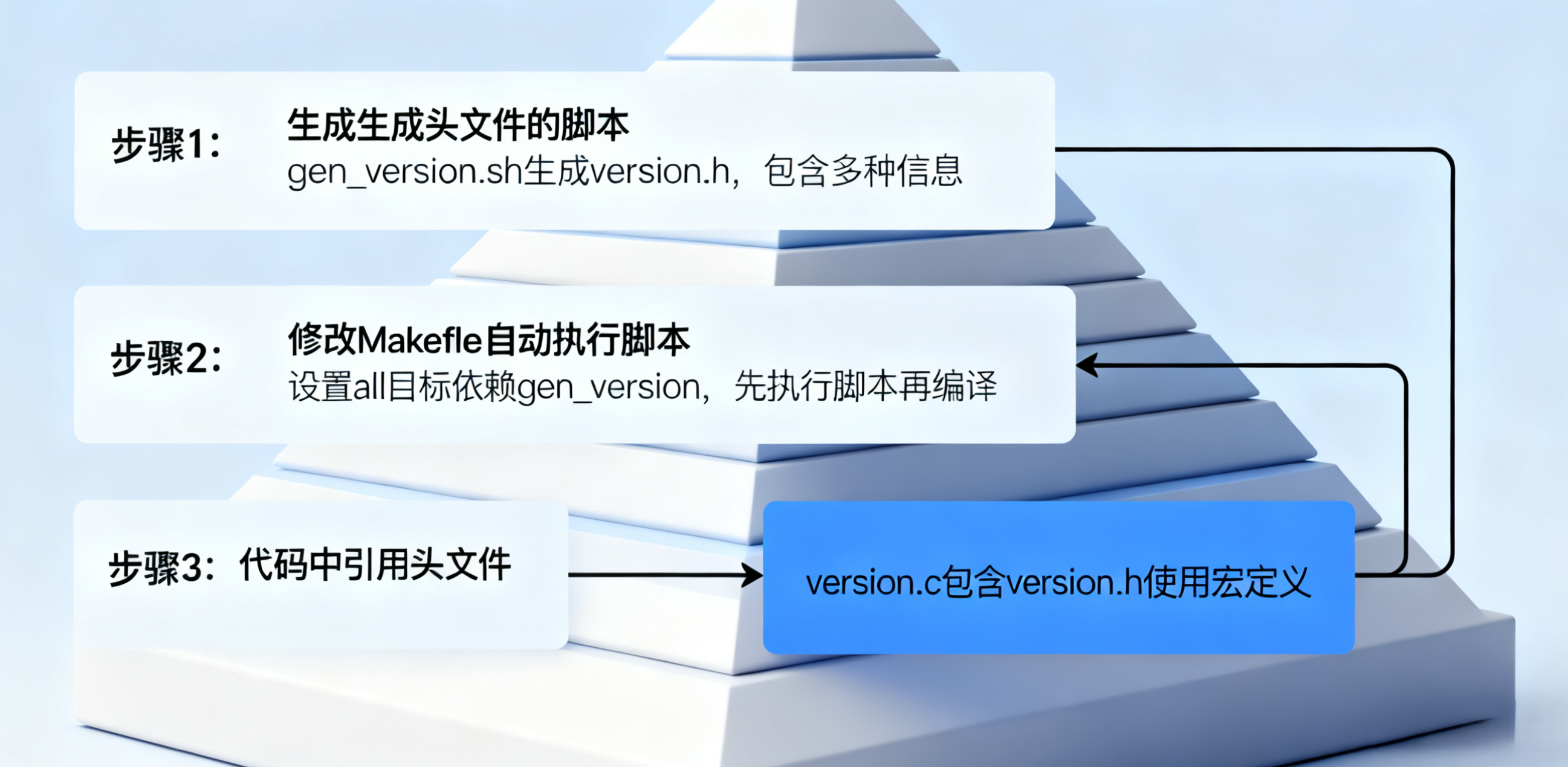 如果要嵌入的信息较多(如硬件配置、依赖库版本、功能开关),可以用 Shell 脚本自动生成version.h头文件,代码中直接包含即可,更易维护。