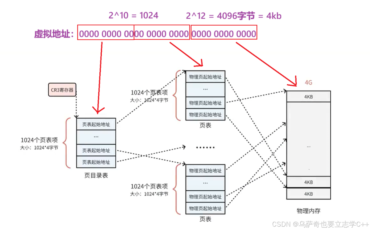 2、虚拟地址32个比特位被划分为10/10/12三部分编译器不参与。