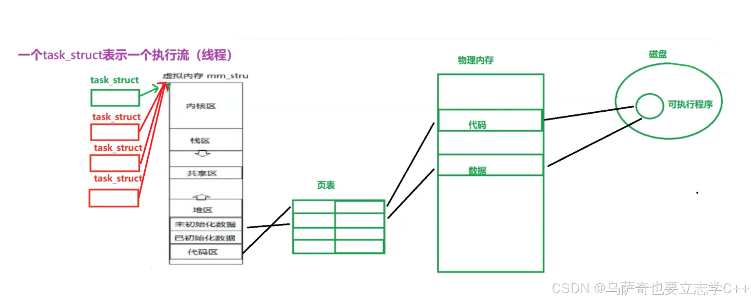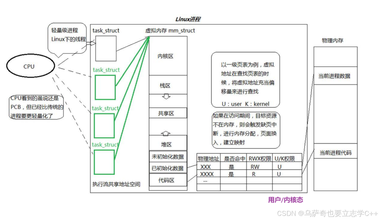 我们知道一个进程要有task_struct、mm_struct、页表和物理内存中进程的代码和数据,当进程创建一个线程后本质就是创建了一个task_struct,指向当前进程的mm_struct,也就是进程和线程共用一个mm_struct、页表,不同的线程各自拥有该进程的代码和数据资源,各自执行当前进程代码的一部分。