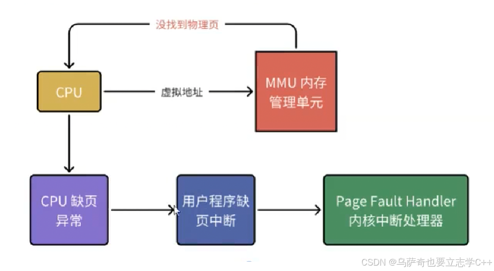 其实这就是缺⻚异常 Page Fault ,它是⼀个由硬件中断触发的可以由软件逻辑纠正的错误。 假如⽬标内存⻚在物理内存中没有对应的物理⻚或者存在但⽆对应权限,CPU 就⽆法获取数据,这种情况下CPU就会报告⼀个缺⻚错误。