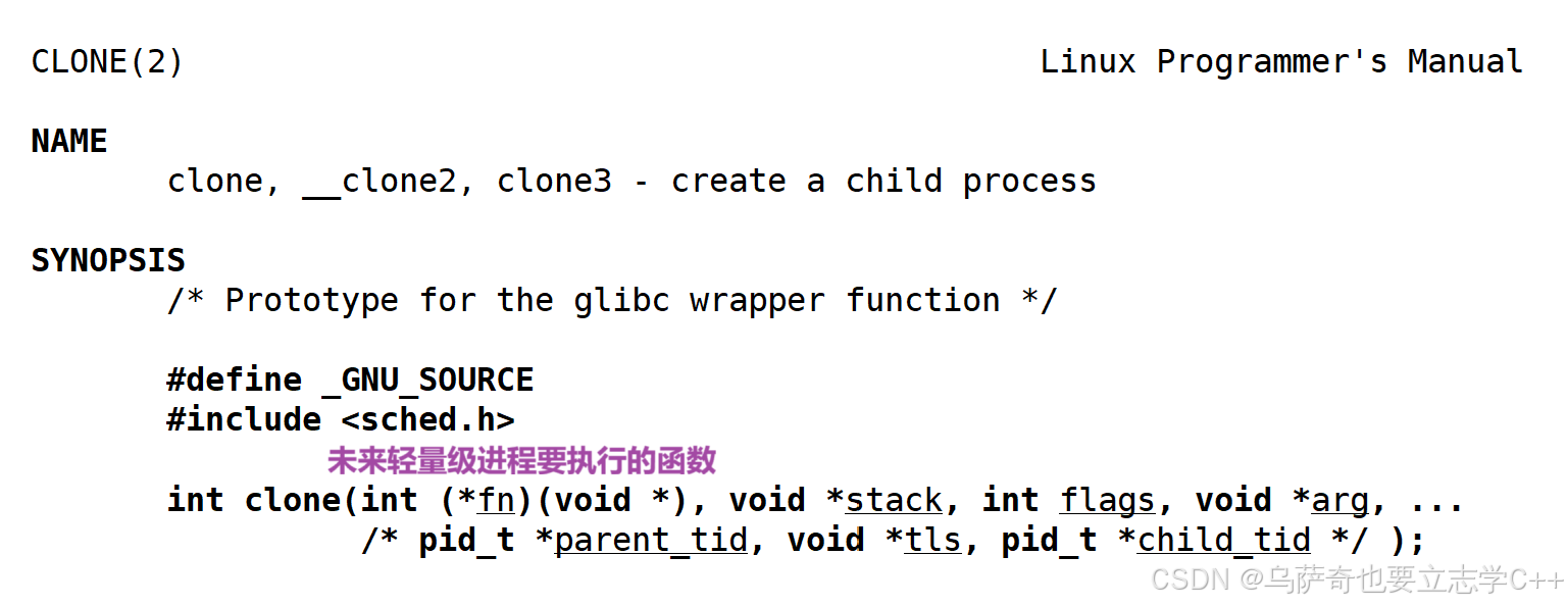 linux中没有创建线程的系统调用,只有创建轻量级进程的系统调用:clone,这个系统调用很复杂,我们只用了解它的第一个参数即可: