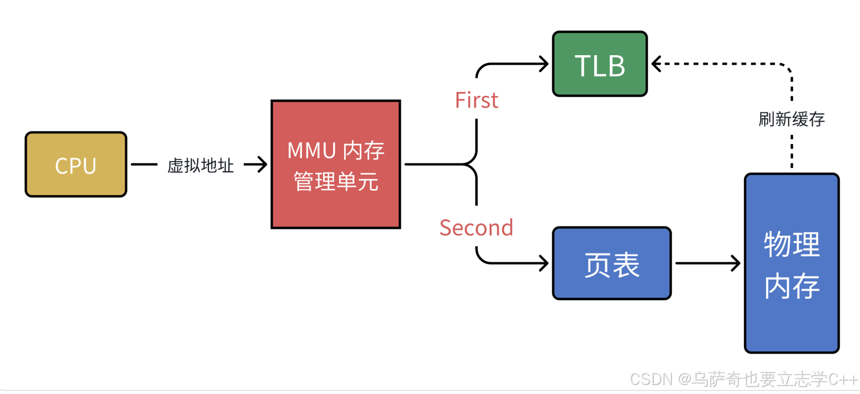 有没有提升效率的办法呢?计算机科学中的所有问题,都可以通过添加⼀个中间层来解决。 MMU 引⼊了新武器,江湖⼈称快表的 TLB (其实,就是缓存)当 CPU 给 MMU 传新虚拟地址之后, MMU 先去问 TLB 那边有没有,如果有就直接拿到物理地址发到总线给内存,⻬活。但 TLB 容量⽐较⼩,难免发⽣ Cache Miss ,这时候 MMU 还有保底的⽼武器⻚表,在⻚表中找到之后 MMU 除了把地址发到总线传给内存,还把这条映射关系给到TLB,让它记录⼀下刷新缓存。