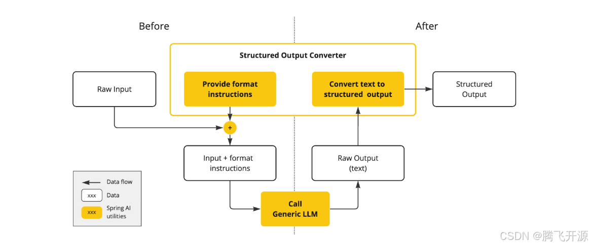 在 LLM 调用之后,转换器获取模型的输出文本并将其转换为结构化类型的实例。此转换过程涉及解析原始文本输出并将其映射到相应的结构化数据表示,例如 JSON、XML 或特定领域的数据结构。