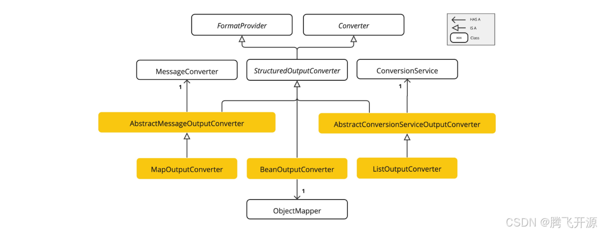 目前,Spring AI 提供了 AbstractConversionServiceOutputConverter、AbstractMessageOutputConverter、BeanOutputConverter、MapOutputConverter 和 ListOutputConverter 实现:
