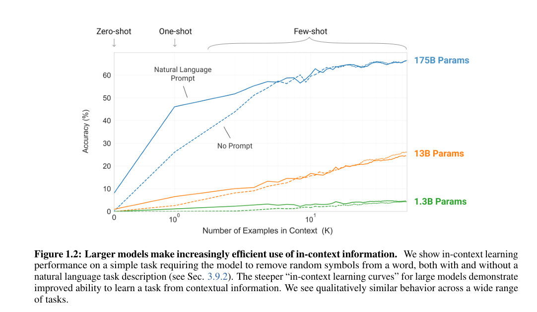 图 1.2:更大规模的模型对上下文信息的利用效率不断提升。我们展示了模型在一项简单任务上的上下文学习表现 ------ 该任务要求模型从单词中移除随机符号,测试分为提供自然语言任务描述和不提供自然语言任务描述两种情况(见 3.9.2 节)。大模型更陡峭的 "上下文学习曲线" 表明,其从上下文信息中学习任务的能力有所提升。我们发现,在各类任务中,模型均表现出定性上相似的行为模式。