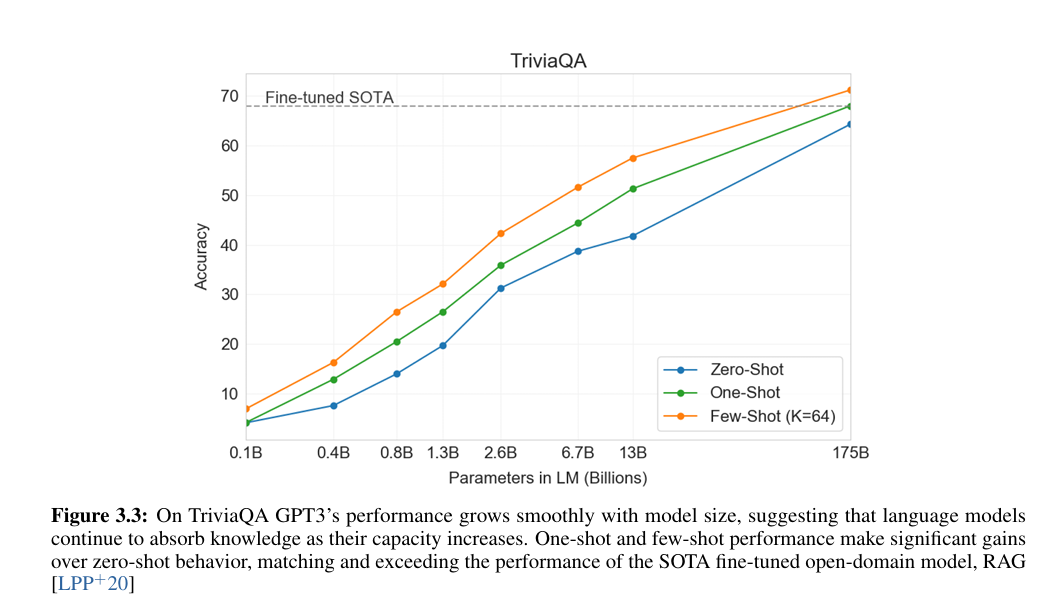 此前 NLP 领域的主流范式是"预训练+任务特定微调":模型先在海量文本上预训练,再针对每个下游任务(如翻译、问答),用数千至数万条标注数据微调。这种方法存在三大局限:一是需为每个任务单独准备大规模标注数据,难以覆盖海量潜在语言任务;二是模型易过度拟合任务特定分布,泛化到新场景时性能下滑;三是与人类学习模式脱节------人类仅需少量示例或自然语言指令就能掌握新任务。论文核心目标是突破这一范式,验证"模型规模扩大是否能解锁任务无关的少样本学习能力"。