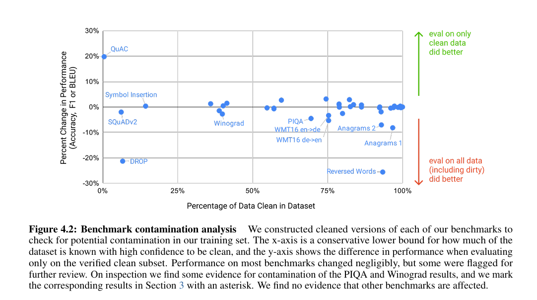 图 4.2:基准测试污染分析 我们为每个基准测试构建了清洗后版本,以检查训练集中可能存在的污染情况。横轴代表经高可信度确认的洁净数据占比的保守下界,纵轴表示仅在已验证的洁净子集上评估时的性能差异。大多数基准测试的性能变化微乎其微,但部分测试需进一步审查。经核查,我们发现 PIQA 和 Winograd 的结果存在污染迹象,并在 3 节中对相应结果标注了星号。未发现其他基准测试受影响的证据。 - 效率与可解释性:1750 亿参数模型推理成本高,无法在普通硬件部署,且决策过程黑箱化,难以追溯错误原因;