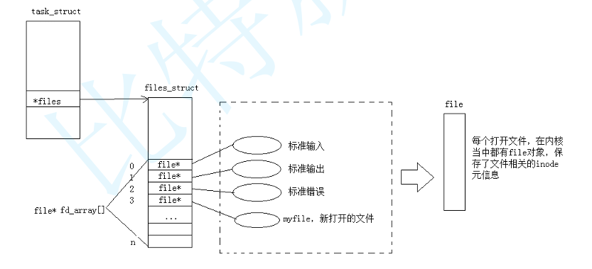 PCB中有files指针,指向一张表files_struct,表中有file数组,数组中每个元素都是指向已打开文件的下标。