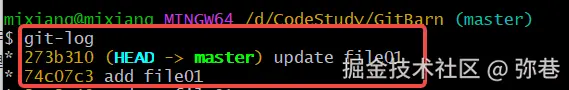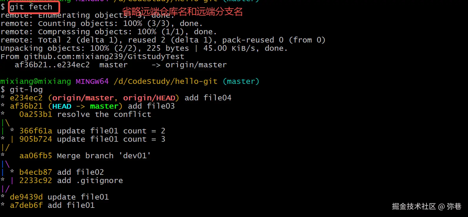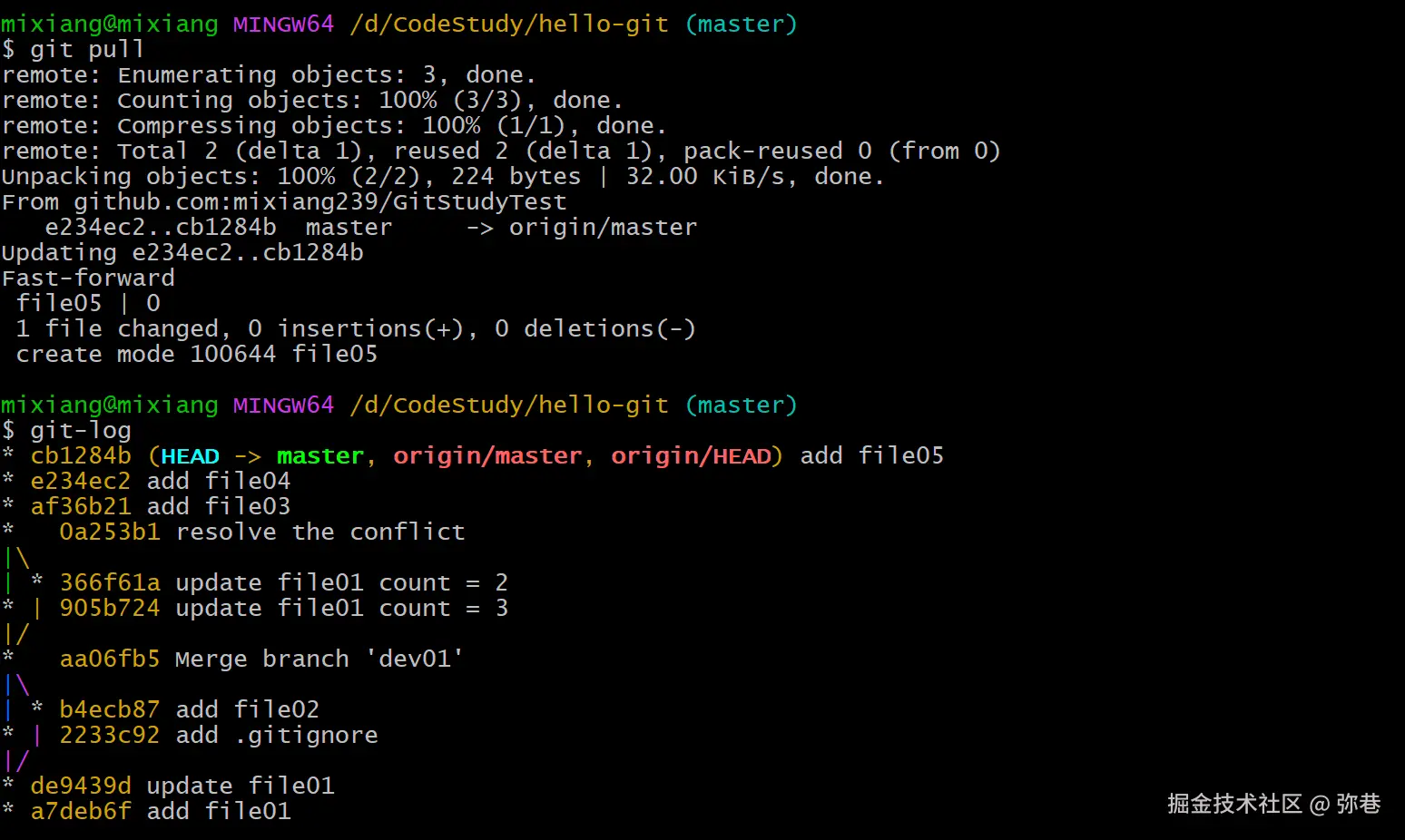 和另一个Git Bash中的日志一样,接下来看看拉取,可以直接抓取并合并。